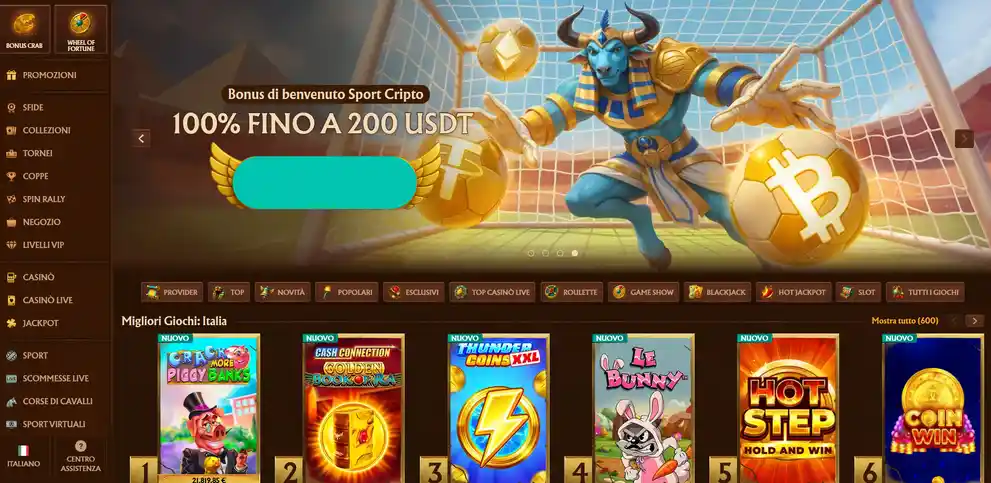 La Pagina Ufficiale AmunRA Casino & Sportsbook funge da punto di ingresso per i giocatori che cercano un ambiente combinato di gioco e scommesse sportive. La piattaforma è stata lanciata nel 2020 e opera con un tema dell'Antico Egitto, presentando divinità come Ra e Anubi nella sua interfaccia. I nuovi utenti arrivano a una homepage progettata per mostrare sia la sezione casinò che quella delle scommesse, con percorsi di navigazione chiari che portano a slot, giochi con dealer dal vivo e mercati dello sportsbook. Il sito opera in oltre 14 lingue, incluso l'italiano, accettando la valuta EUR per i giocatori locali.
